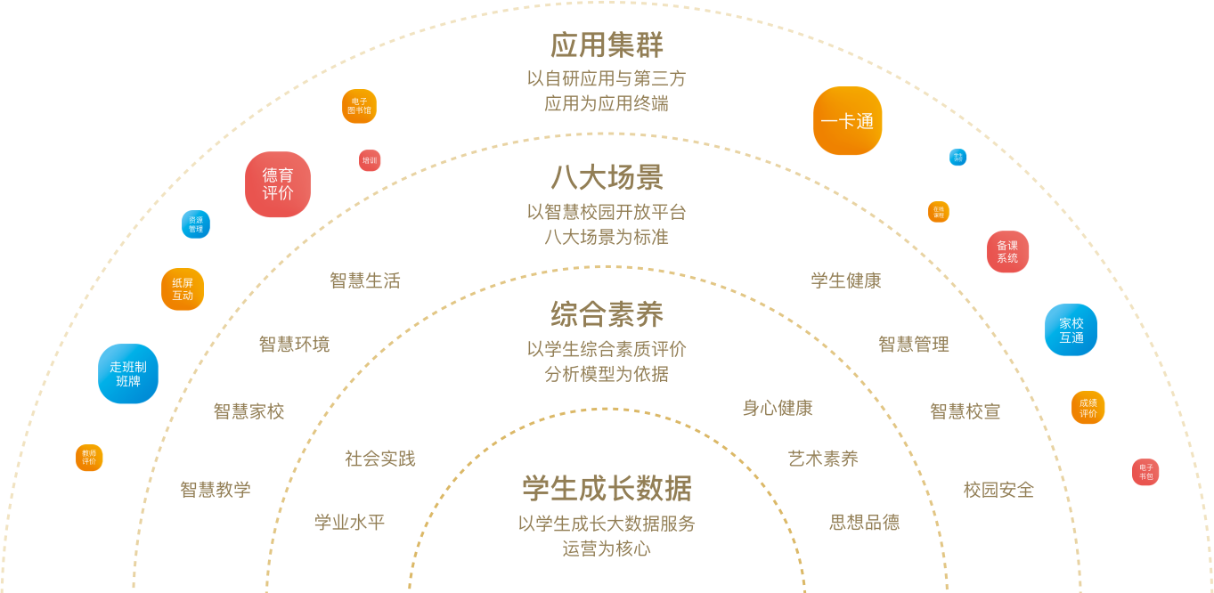 | 消毒系统 | 走班排课 | 互动课堂 | 家校通知 | 校园缴费 | 电子图书馆 | 消毒体系 | |
